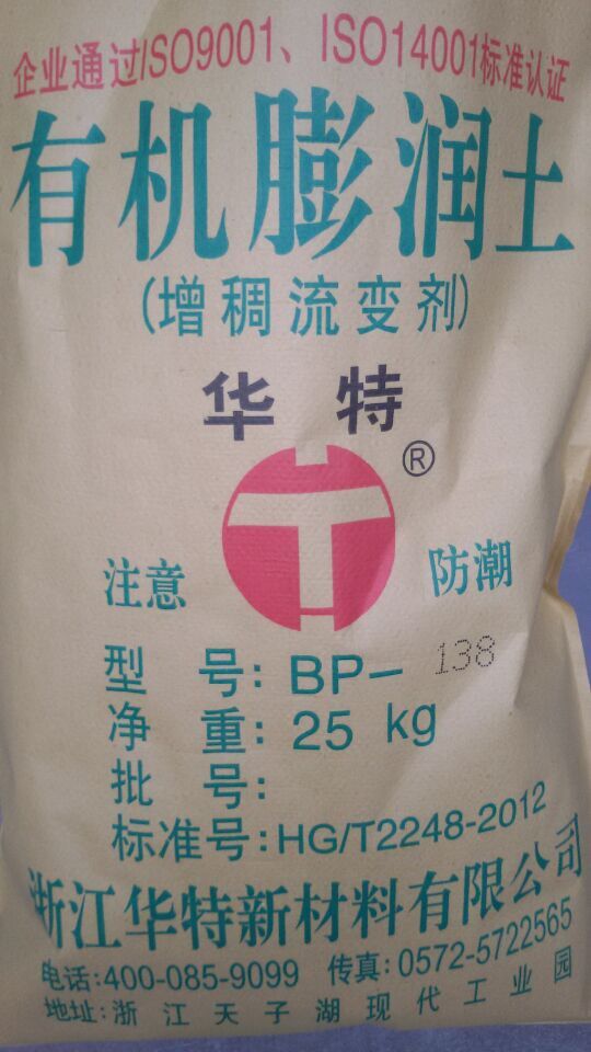 华特市场部 联系电话 小赵 15867108138 有机膨润土是膨润土经高度提纯,改性和有机插层制备而成,产品从膨润土的亲水膨胀性转变为亲油膨胀性,再适当的剪切力和化学能的作用下,于各种溶剂和有机介质中分散成超微米甚至纳米薄片,并在边缘氢键的作用下形成“卡片屋”式结构,遇外力作用时结构解理,外力消失或减弱时恢复,在溶剂和介质中变现为触变作用。广泛应用于涂料,油墨,密封胶,润滑脂,钻井泥浆,化妆品等领域作增稠剂触变剂,控制颜料固体颗粒沉淀,避免施工及使用过程流挂或垂流